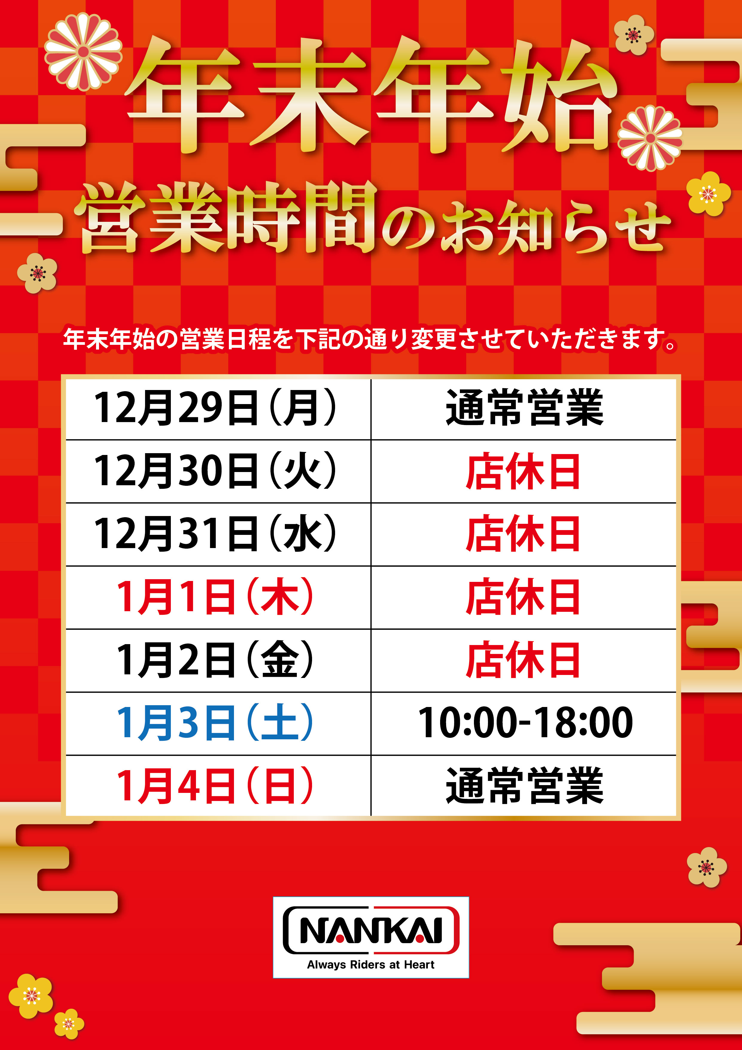 2025年12月13日年末年始・営業時間のご連絡あっという間に12月になり、 どんどん今年も残り少なくなってきますが、 最終営業日(29日(月))までよろしくお願いいたします 年明けは、3日(土)からの営業となり、 営業時間が通常と違いますので、ご注意ください posted by 南海部品沖縄店 at 18:46| 営業時間・所在地